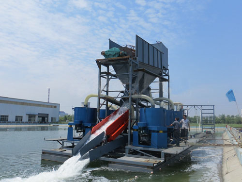 由水下沖洗泵將料泛起,然后由抽砂泵將料抽出;經(jīng)輸送管道將料輸送至緩沖水箱后,經(jīng)溜槽流入滾動篩;由篩子側(cè)位沖水管注水將料攪勻;由轉(zhuǎn)篩將小石子分離后經(jīng)流槽輸出;沙子經(jīng)分流器后均勻通過水套離心機選礦,尾礦采用鼓動流槽進一步精選尾礦。