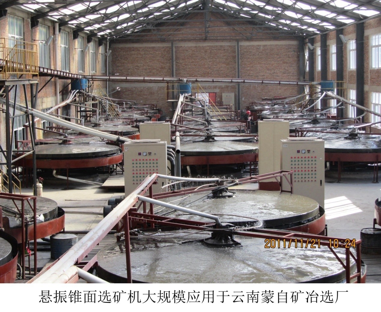 懸振錐面選礦機”是依據拜格諾剪切松散理論和流膜選礦原理研制而成的新型微細粒重選設備。當攪拌均勻的礦漿從分選錐面的給礦器進入盤面初選區時,礦漿流即成扇形鋪展開向周邊流動,在其流動過程中流膜由厚逐漸變薄,流速也隨之逐漸降低。